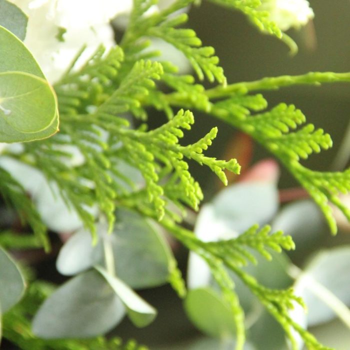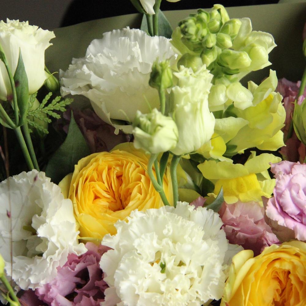 Роза пионовидная – 5 шт.Лизиантус – 6 шт.Львиный зев – 3 шт.Туя – 3 шт.Паникум – 2 шт.Эвкалипт – 5 шт.Упаковка – 2 шт.Лента атласная – 1 шт.