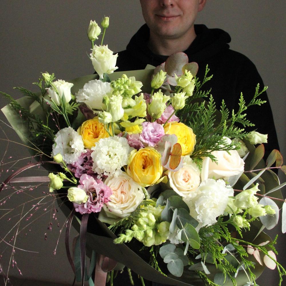 Солнечный, душистый букет с пионовидными розами, львиным зевом, туей, паникумом, лизиантусом и эвкалиптом.Стильное цветочное решение для любого случая.