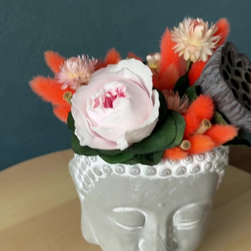 Это не просто букет цветов. А композиция, которая несет в себе философию, что наша жизнь цикличнаПионовидная роза – как распускающийся цветущий лотос А рядом с ней уже сухоцветный лотос, который уже отцвел, но в нем хранятся семена, которые в дальнейшем дадут жизнь новым цветкамЯркий оранжевый лагурус символизирует оранжевое одеяние Будды——————————————————Роза в композиции настоящая, прошедшая специальную обработку стабилизацииБукет из сухоцветов и стабилизированных цветов не завянет, а будет радовать несколько летСухоцветы не требуют трепетного ухода, ведь им не нужна вода, они не притягивают пыль, и сами не осыпаютсяК букету прилагается памятка, как сохранить внешний вид букета на несколько лет