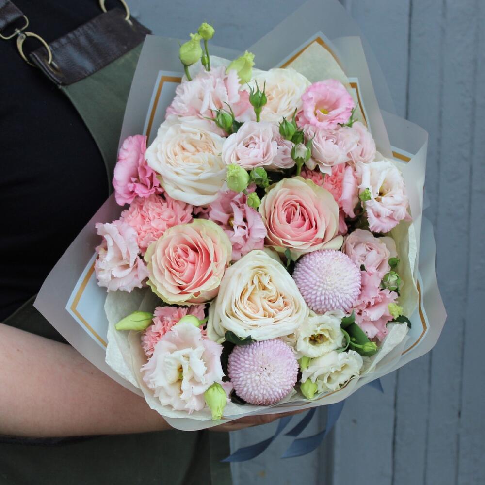 роза пионовидная вайт o’hara – 3 шт.роза фруттето – 2 шт.момоко – 2 шт.роза сортовая иноссенсия пинк – 1 шт.Диантус – 3 шт.эустома махровая селеб квин – 2 шт.Тишью – 3 шт.Пленка матовая – 2 шт.Лента атласная – 2 шт.
