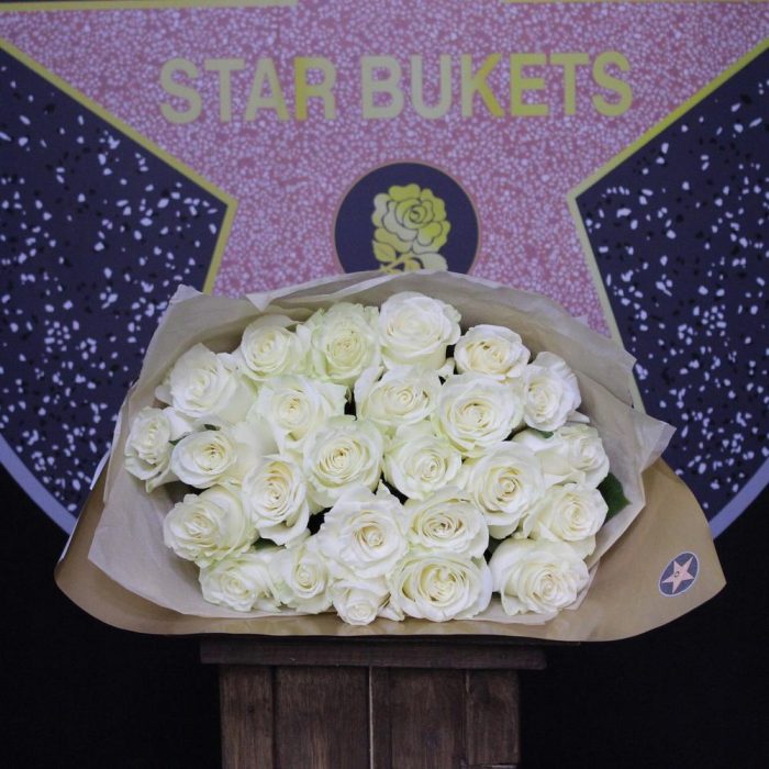 Роза Мондиаль – 25 шт.Тишью – 2 шт.Пленка дизайнерская – 2 шт.Лента атласная – 2 шт.