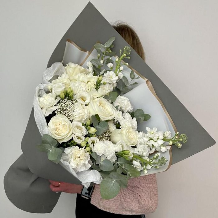 Гортензия – 1 шт.Роза Эквадор – 5 шт.Лизиантус – 2 шт.Маттиола – 4 шт.Озотамнус – 2 шт.Диантус – 5 шт.Сантини – 2 шт.Эвкалипт – 2 шт.Упаковка дизайнерская – 4 шт.