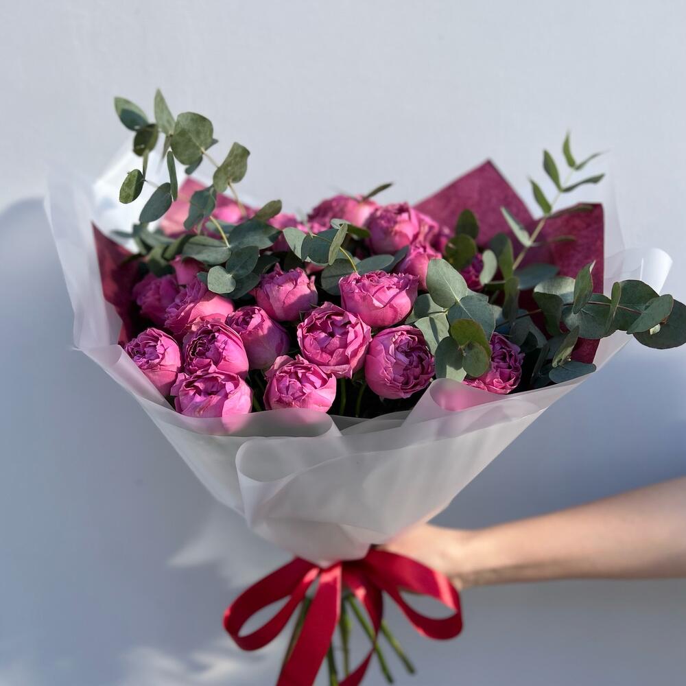 Эвкалипт – 2 шт.Лента атласная – 1 шт.Тишью – 2 шт.Пленка матовая – 1 шт.роза мисти бабл – 7 шт.