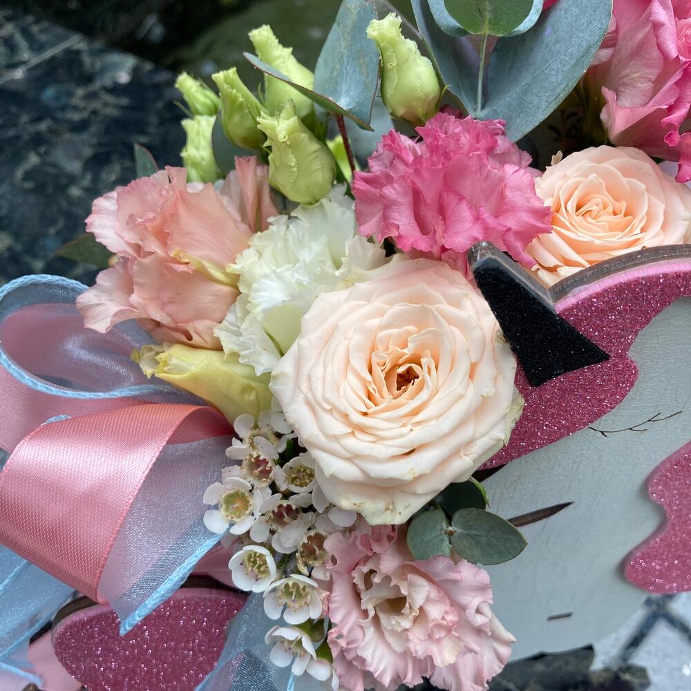 Волшебный сон – композиция из лизиантуса, роз и ваксфлауэра в декоративном ящике «Единорог»