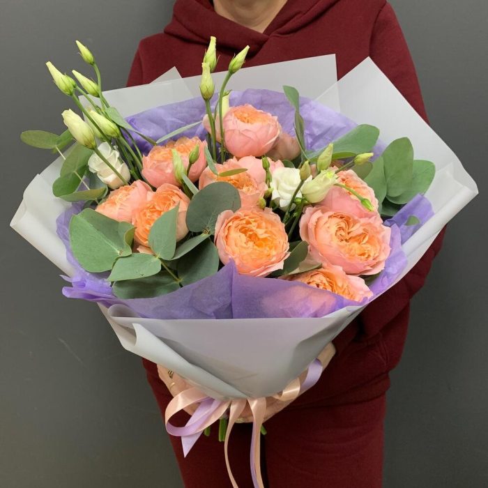 Эвкалипт – 5 шт.Лента атласная – 2 шт.Тишью – 1 шт.Лизиантус белый – 3 шт.Упаковка корейская пленка – 1 шт.роза кустовая пионовидная премиум джульетта – 3 шт.