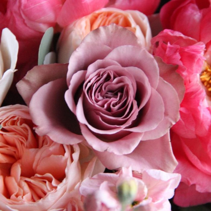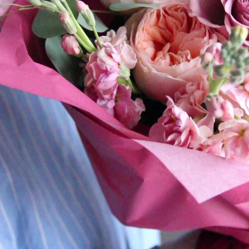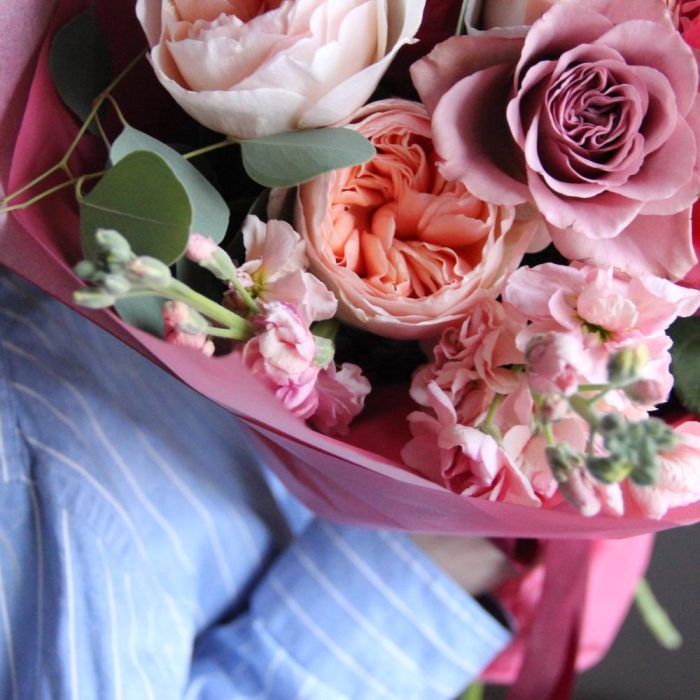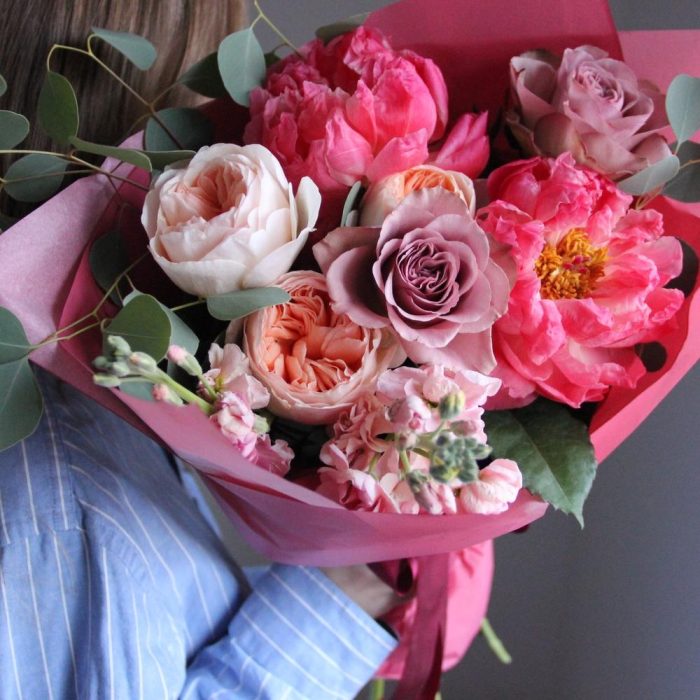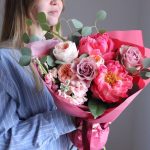 Маттиола – 2 шт.Пион – 2 шт.Эвкалипт – 3 шт.Лента атласная – 1 шт.Тишью – 2 шт.Роза пионовидная – 3 шт.Роза сортовая – 2 шт.