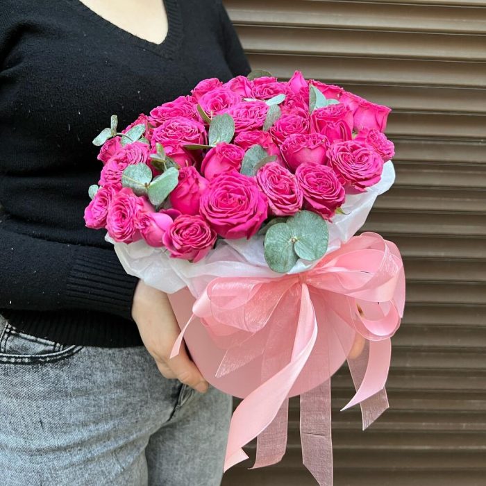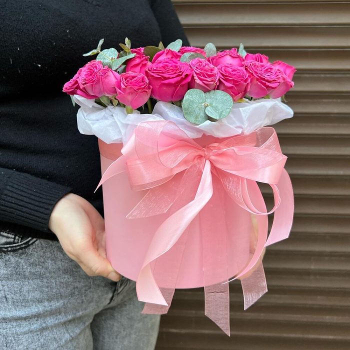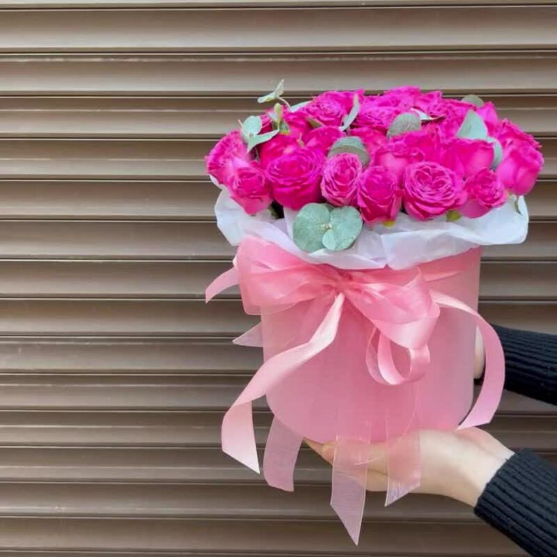 Эвкалипт – 1 шт.Лента атласная – 2 шт.Тишью – 1 шт.Коробка шляпная – 1 шт.Оазис флористический – 1 шт.классик сенсейшен – 11 шт.