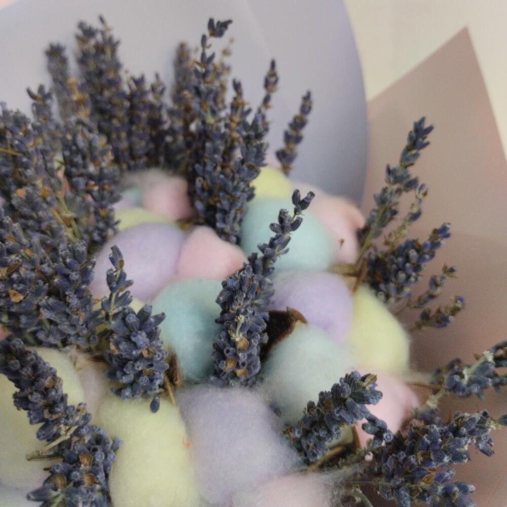 «Лавандовое созвездие» Букет из розы, гвоздики, статица и хлопка