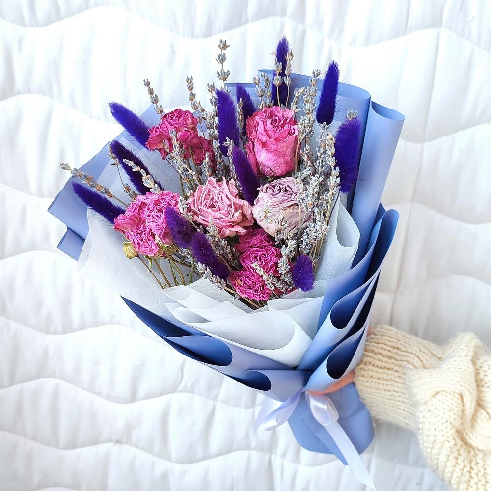 «Лавандовое созвездие» Букет из розы, гвоздики, статица и хлопка