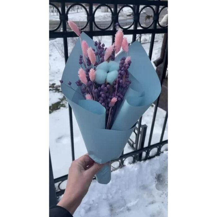 Хлопок натуральный – 1 шт.лëн сухоцвет – 25 шт.Фаларис – 12 шт.Упаковка дизайнерская – 3 шт.Лента атласная – 1 шт.