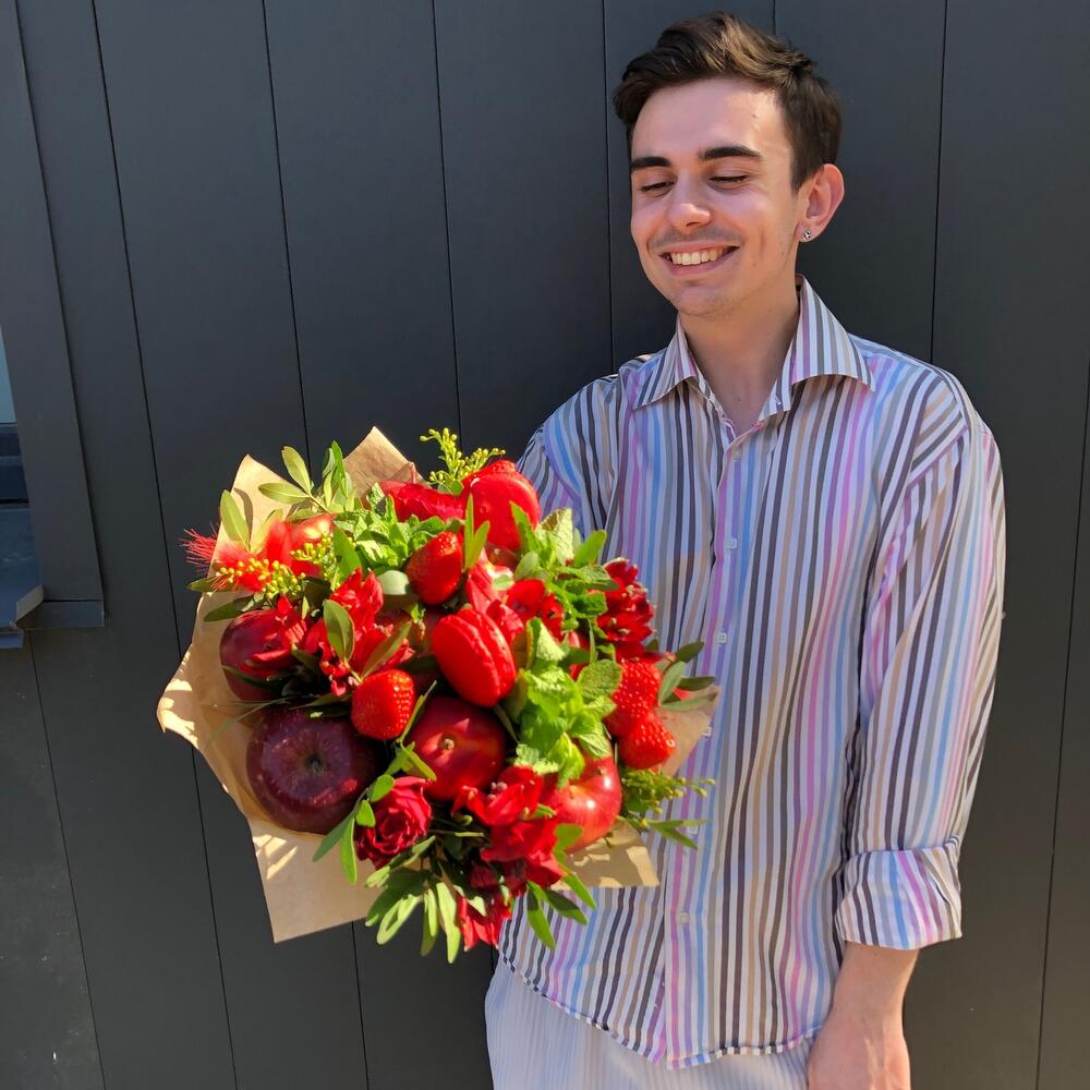 нектарины или сливы – 7 шт.яблоки – 7 шт.Мята пучок – 4 шт.Альстромерия – 8 шт.Лагурус – 6 шт.фисташка зелень – 3 шт.розы – 2 шт.