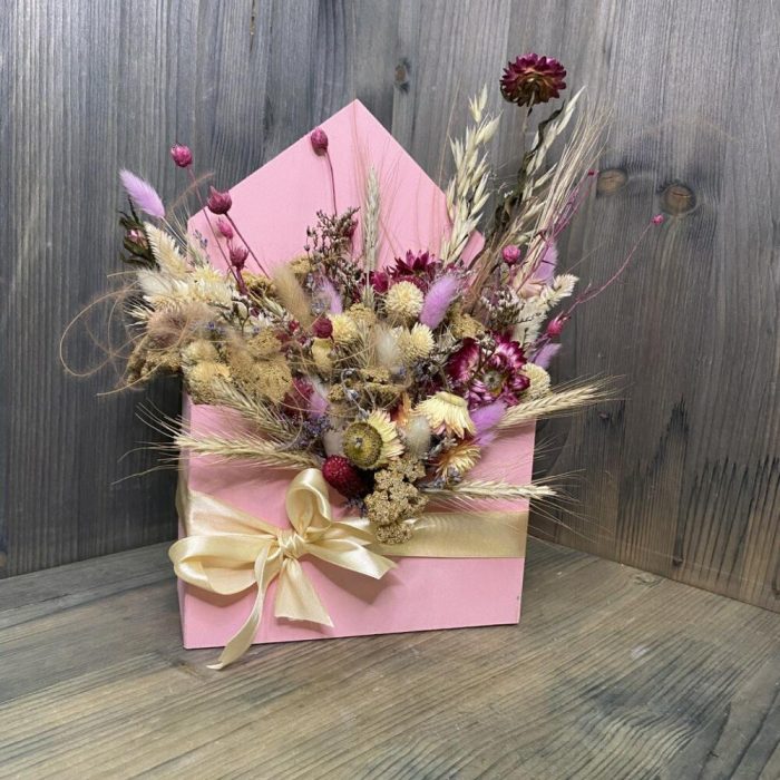 Конверт деревянный – 1 шт.Оазис для сухоцветов – 1 шт.Ковыль – 2 шт.овес сухоцвет – 2 шт.Рожь – 5 шт.Пшеница (сухоцвет) – 10 шт.Лагурус – 25 шт.Лаванда сухоцвет – 10 шт.прочие сухоцветы – 30 шт.
