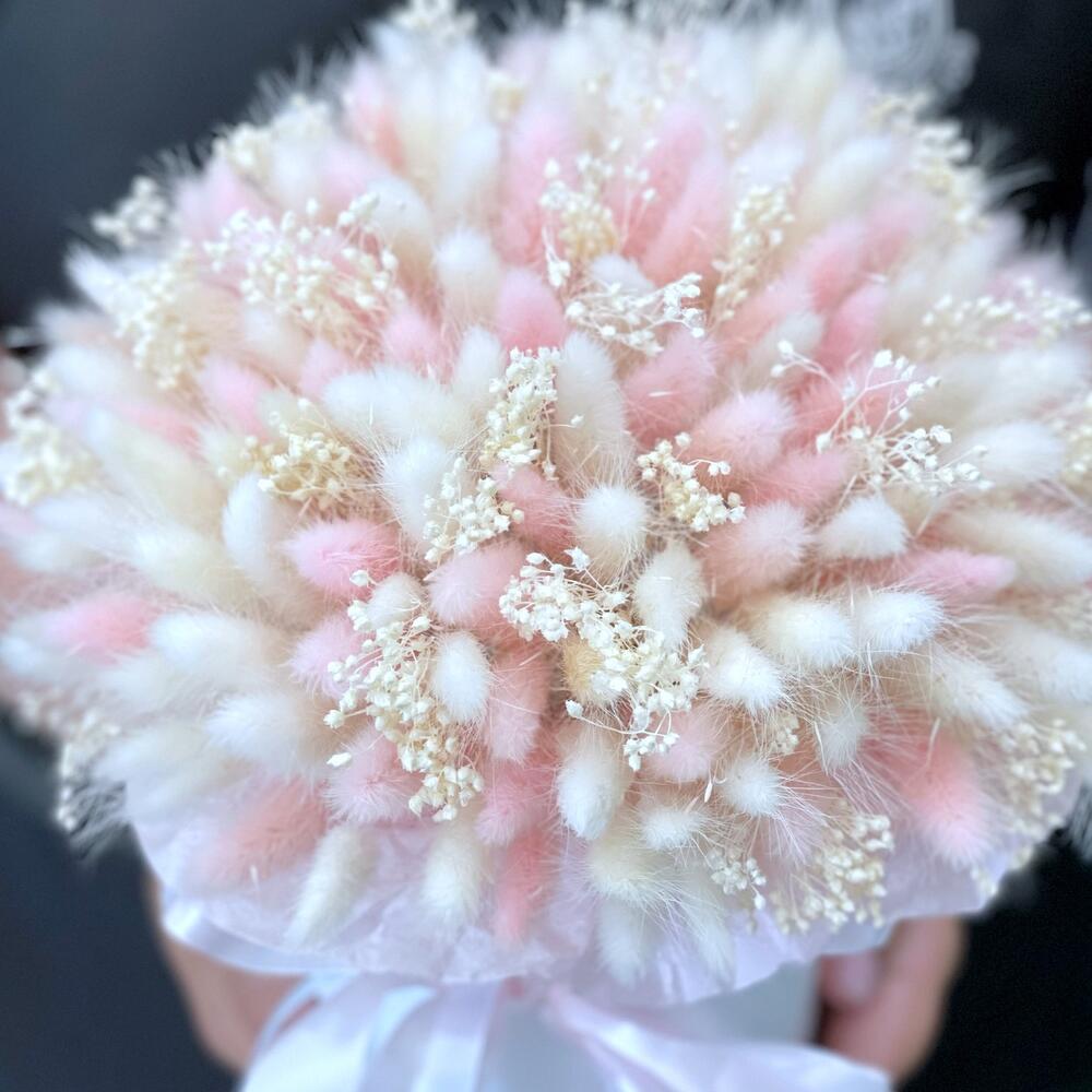 Лагурус (сухоцвет) – 45 шт.блом бром – 20 шт.Коробка шляпная – 1 шт.бант атласный – 1 шт.