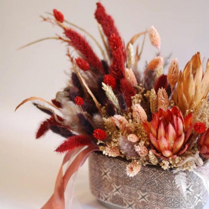 протечку сухоцвет – 3 шт.пальмовое копье – 2 шт.фаларис сухоцвет – 30 шт.Лагурус (сухоцвет) – 50 шт.гривелия – 2 шт.сухоцветы пучок – 15 шт.пшеница колосья – 15 шт.пушистики – 3 шт.ветки декоративные – 2 шт.Кашпо керамическое – 1 шт.
