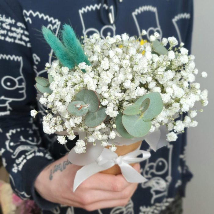 Гипсофила – 3 шт.Эвкалипт пучок – 1 шт.Лагурус – 2 шт.кофейный стакан – 1 шт.Оазис флористический – 1 шт.Упаковка – 120 шт.