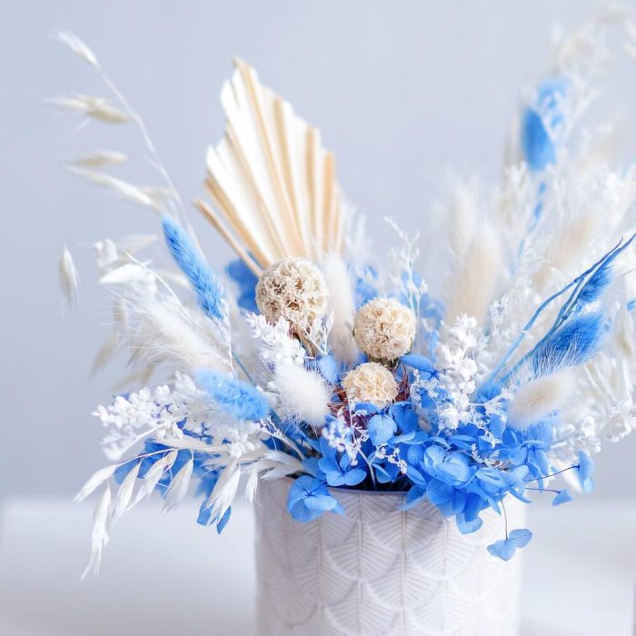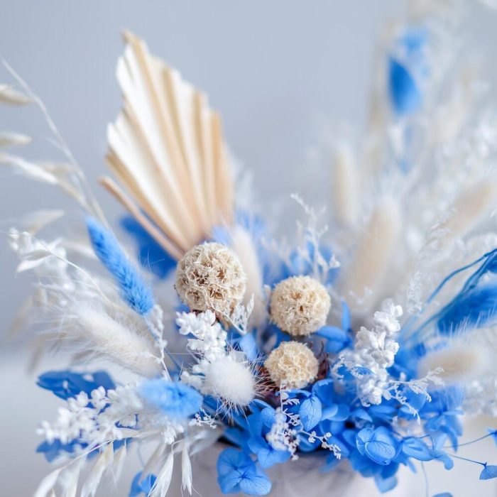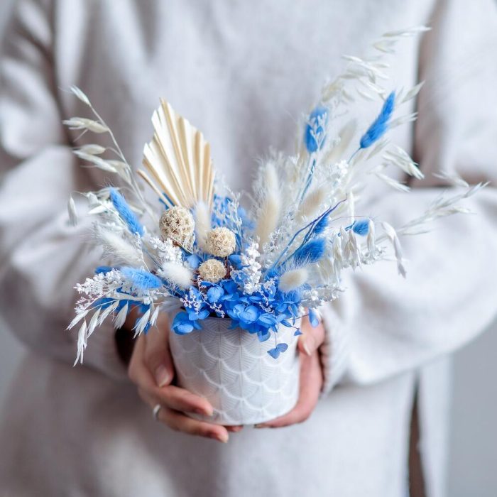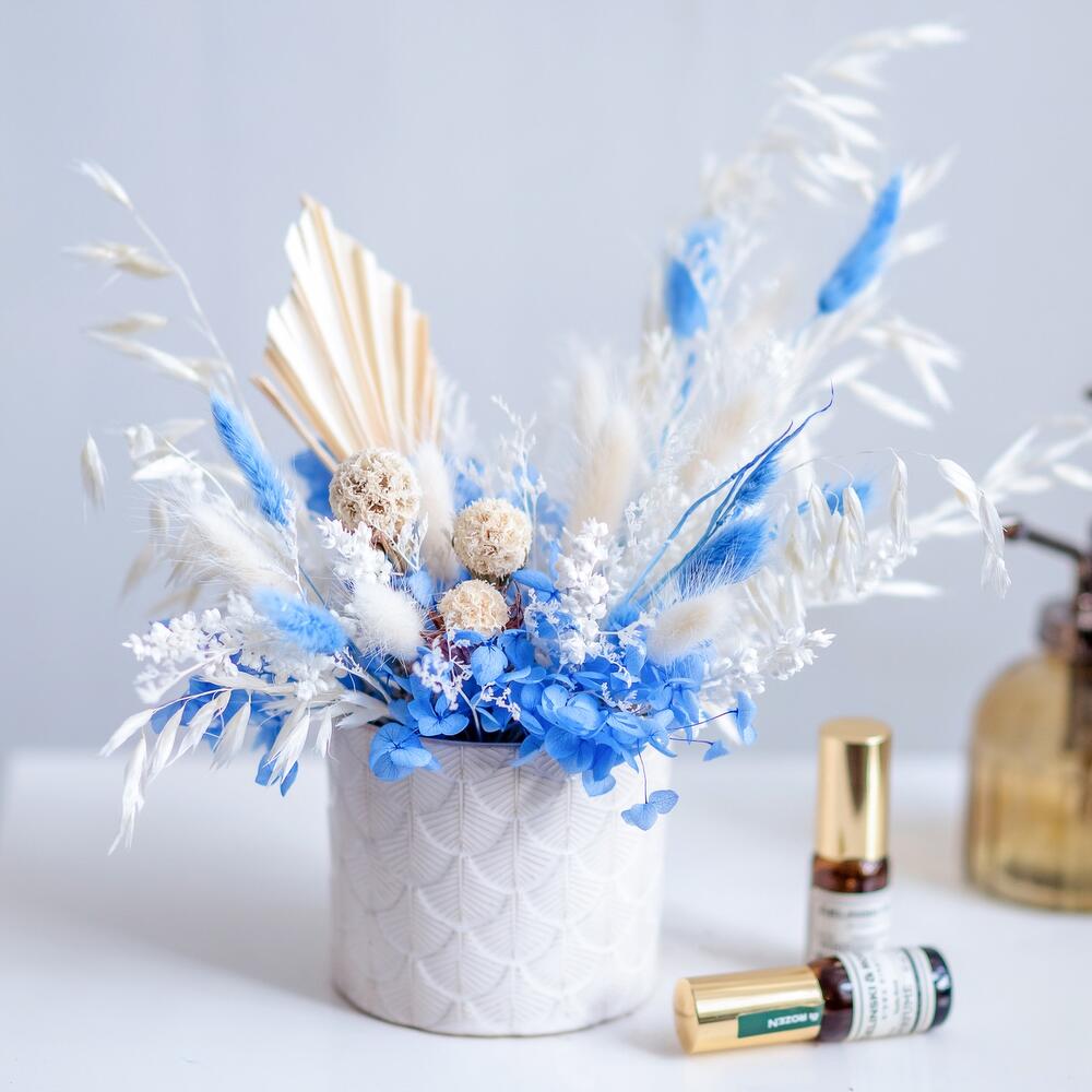Скабиоза – 3 шт.Лагурус – 2 шт.Кашпо керамическое – 1 шт.Лист пальмы – 1 шт.Дизайнерская упаковка – 1 шт.гортензия стабилизированная – 1 шт.сорго – 1 шт.мох ягель стабилизированный – 1 шт.лимониум стабилизированный – 1 шт.дикий овес – 1 шт.