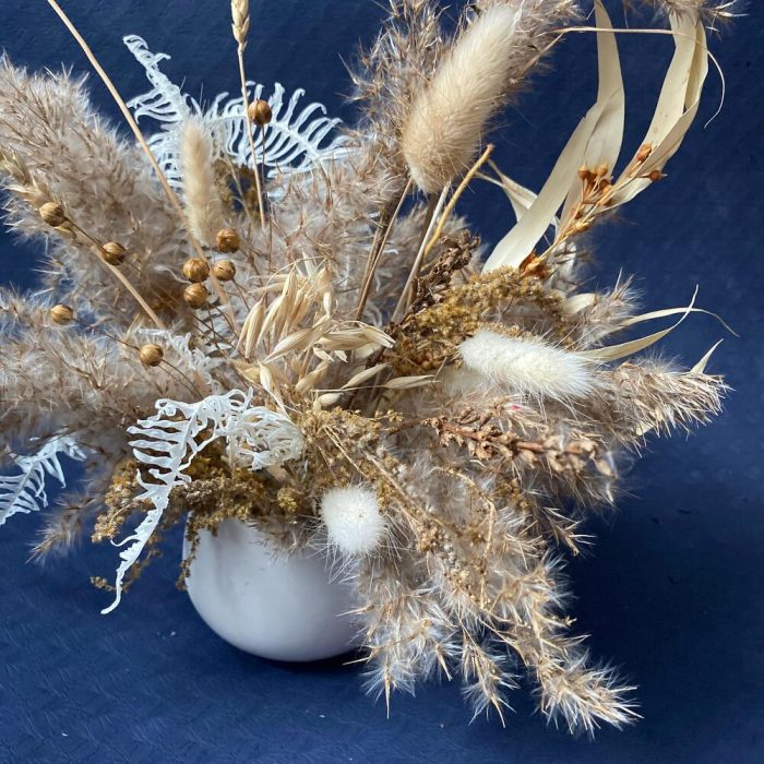 Кашпо керамическое – 1 шт.Оазис флористический – 1 шт.Лагурус – 5 шт.кортадерия – 7 шт.лен сухоцвет – 1 шт.папоротник стабилизированный – 3 шт.Эвкалипт стабилизированный – 3 шт.Колосья – 3 шт.солидаго сухоцвет – 9 шт.