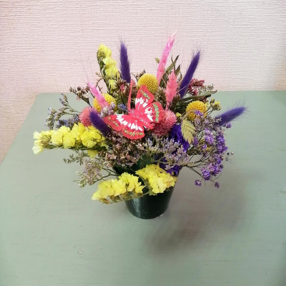 Краспедия желтая – 3 шт.Лагурус (сухоцвет) – 4 шт.Пшеница (сухоцвет) – 3 шт.Статица – 1 шт.Лимониум – 1 шт.Бабочка декоративная – 1 шт.Оазис флористический – 1 шт.Кашпо керамическое – 1 шт.