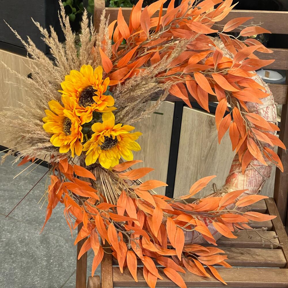 искусствееная ветка осенняя – 6 шт.подсолнух желтый искусственный – 3 шт.сухоцветы пучок – 6 шт.Венок – 1 шт.