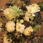 Кремовый букет с ранункулюсами, колокольчиками, лизиантус коробочками лотоса, лавандой и садовой зеленью.