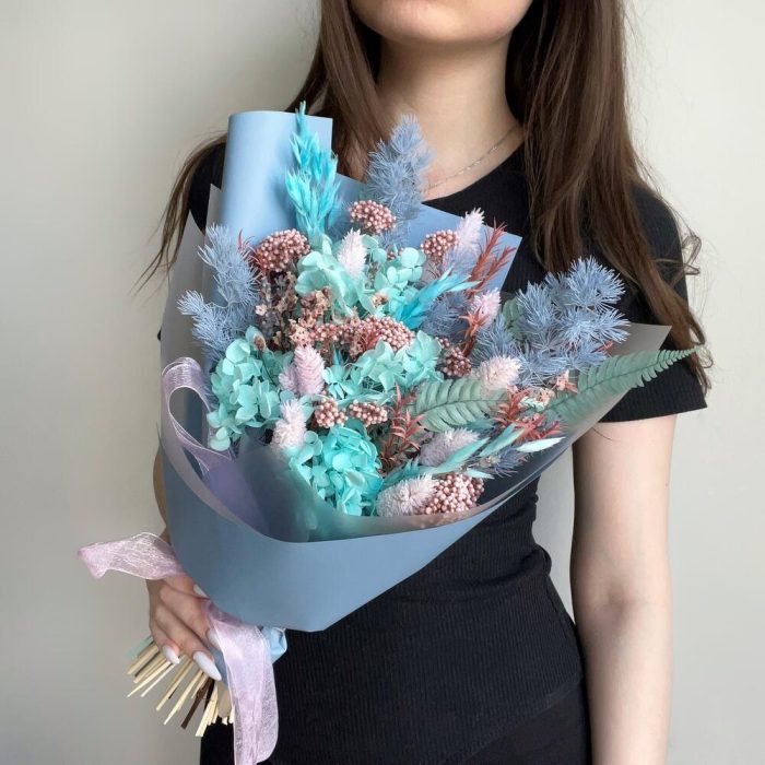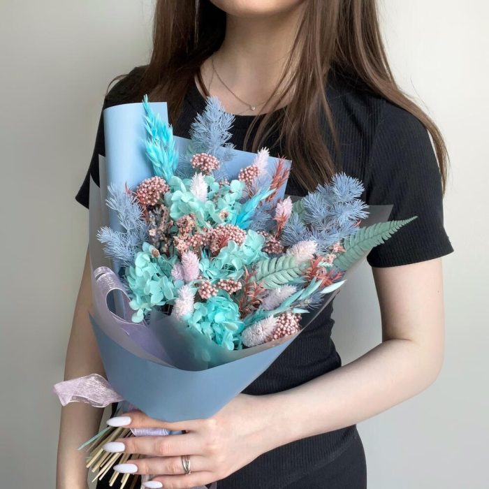 Озотамнус – 1 шт.Сухоцветы – 1 шт.Упаковка дизайнерская – 1 шт.Гортензия голубая – 1 шт.чайное дерево – 1 шт.
