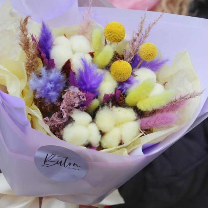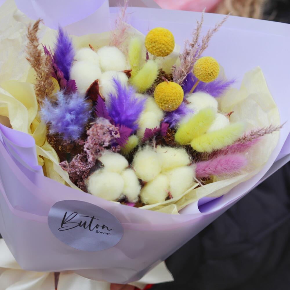 Хлопок (сухоцвет) – 5 шт.Краспедия – 3 шт.Сетария – 3 шт.Лагурус – 7 шт.Папоротник – 1 шт.Открыточка с вашими пожеланиями – 1 шт.Шоколадка – 1 шт.