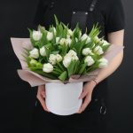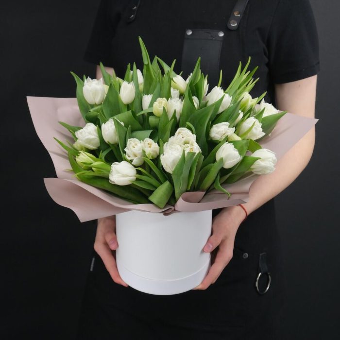31 белый пионовидный тюльпан в шляпной коробке