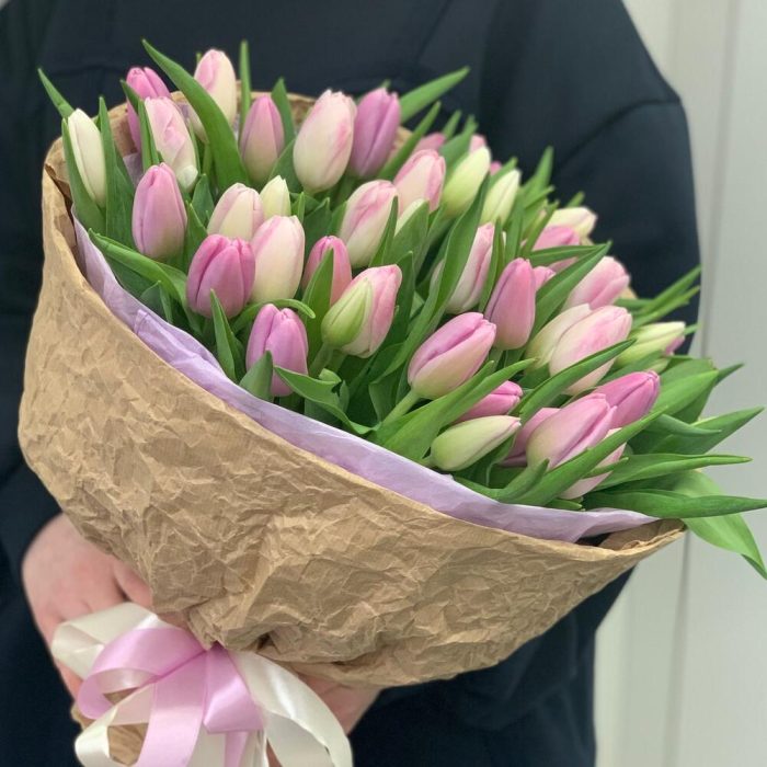 Тюльпан – 51 шт.Дизайнерская упаковка – 2 шт.Атласная лента – 1 шт.
