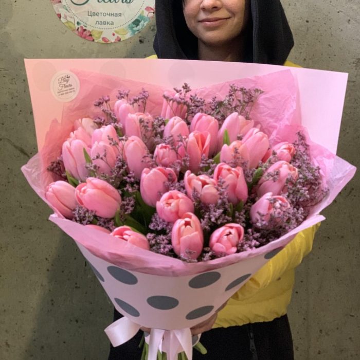 Тюльпан – 25 шт.Лимониум – 3 шт.Упаковка дизайнерская – 1 шт.Лента атласная – 1 шт.